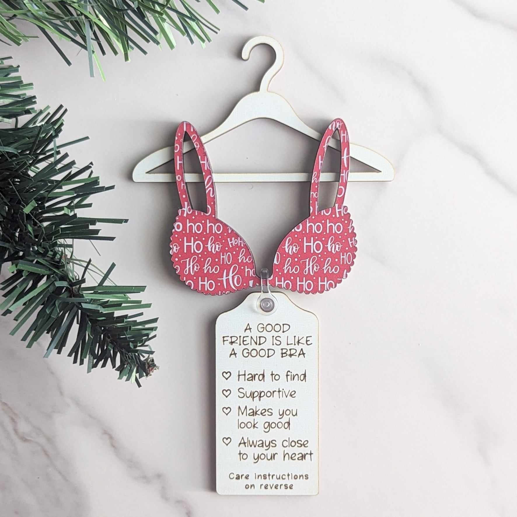 This charming ornament features a mini hanger with a cute bra attached, and a tag in the middle that reads the perfect sentiment for your closest friends. The back of the tag includes a space to personalize with "To" and "From," making it a thoughtful and personal gift.