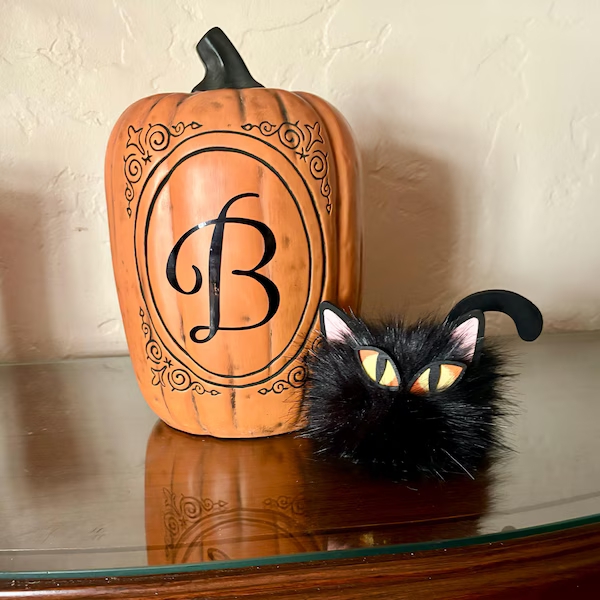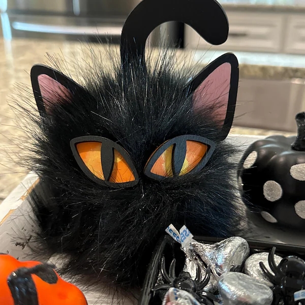 🖤With its fluffy black faux fur, glowing orange cat eyes, and curved tail, this handmade pompom cat captures the spirit of Halloween without being overly spooky.
